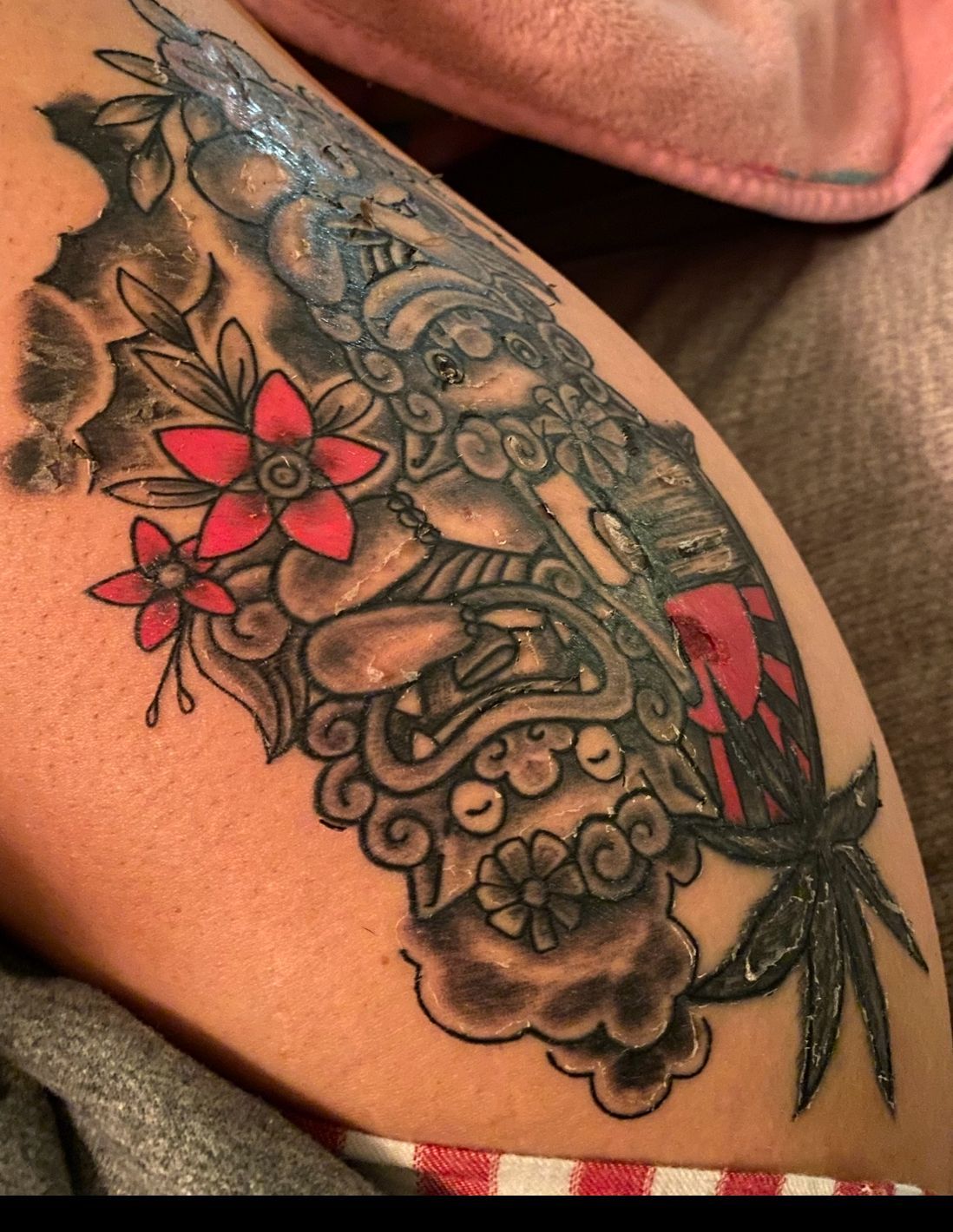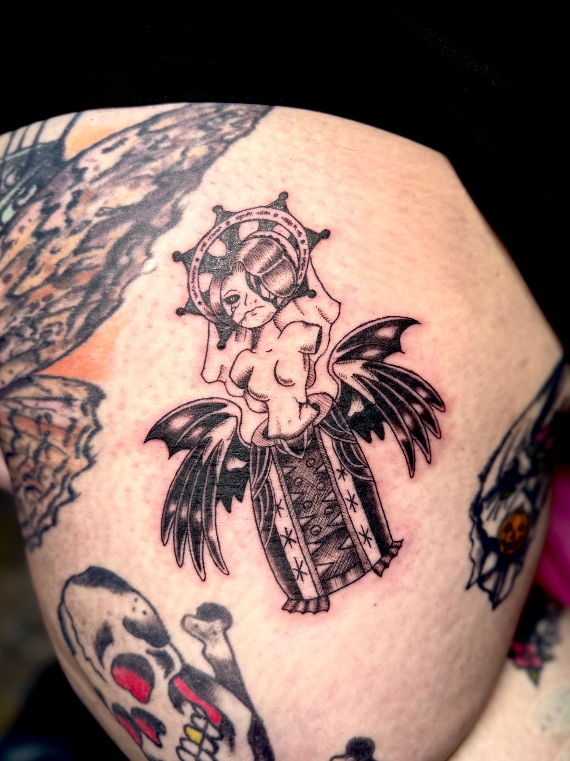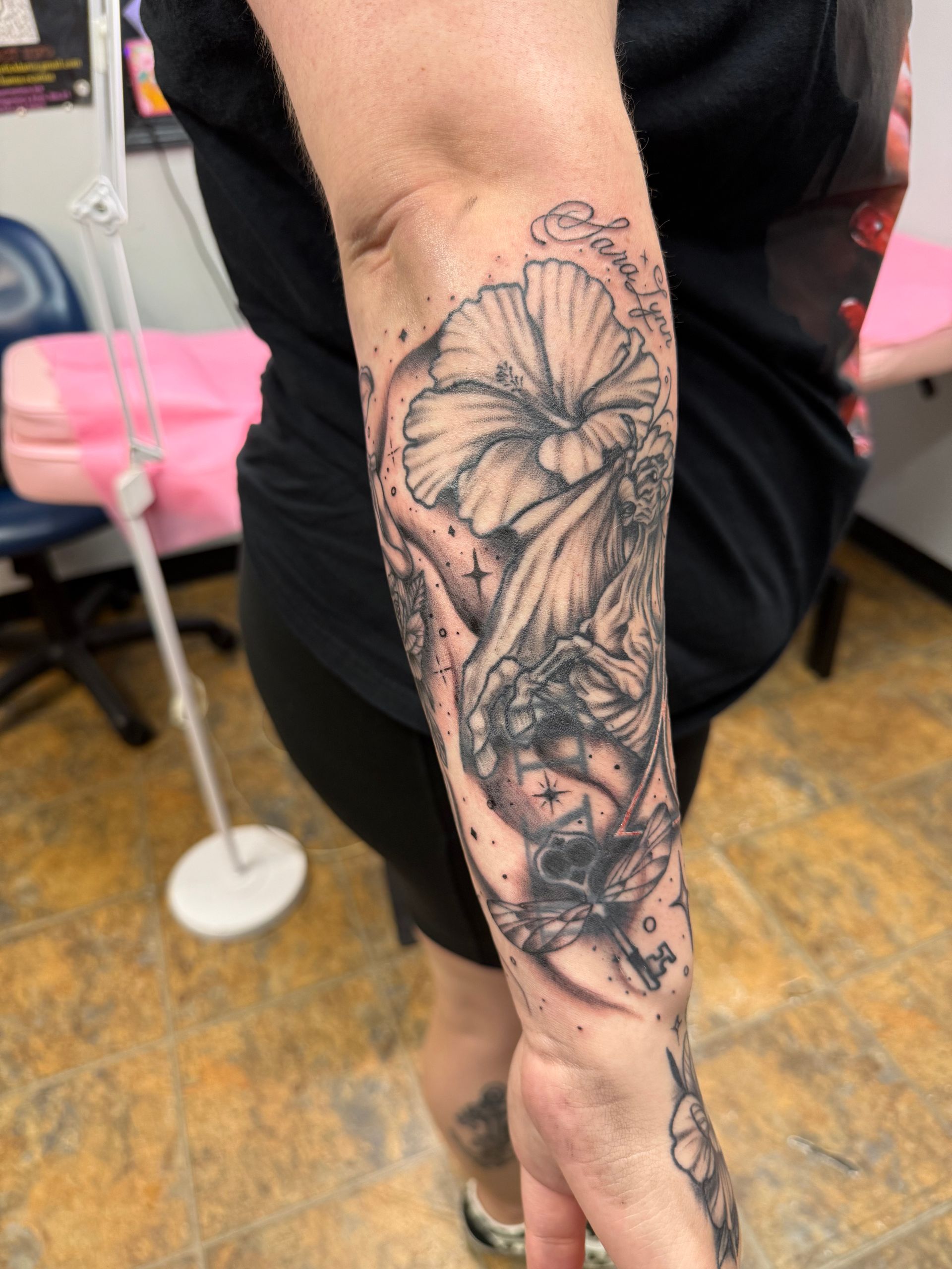 Adrianna is also a fabulous tattoo artist that I had gotten tattoo work with most recently, I came in to get a consolation of a tattoo cover up. She took a look at what I wanted to cover and off the bat she had quite a few ideas and was happy to work with the tattoo style I wanted too. Also was very sweet and worked within my budget for some fantastic work. We came to a conclusion of what I wanted tattooed and she did amazing the line work and style is all I could’ve hoped for and it came out spectacular.